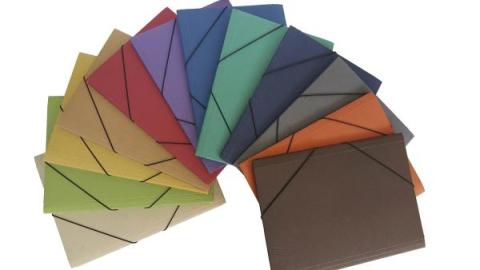 Carpetas fabricadas con cartoncillo 100% reciclado. Con 3 solapas y lomo de unos 5 cm. de grosor. 12 atractivos colores, paquetes de 5 unidades.