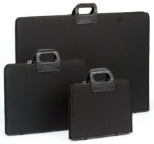7Carpetas de nylon con cremallera y gomas interiores. Especialmente indicadas para el transporte de láminas de dibujo, pósters, trabajos de diseño, etc. Las medidas de 62x86 cm. y 75x106 cm. se presentan con bandolera y asa lateral, y las medidas 44x62, 56x78 cm. con bandolera. Color negro.