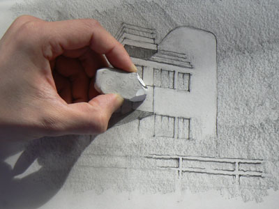 Técnica del borrado: Una goma también sirve para trabajar en negativo. Al aplicarla sobre una superficie sombreada, va a abrir zonas blancas, es decir, borrar ciertas zonas para recuperar el blanco del papel y crear así espacios de luz.